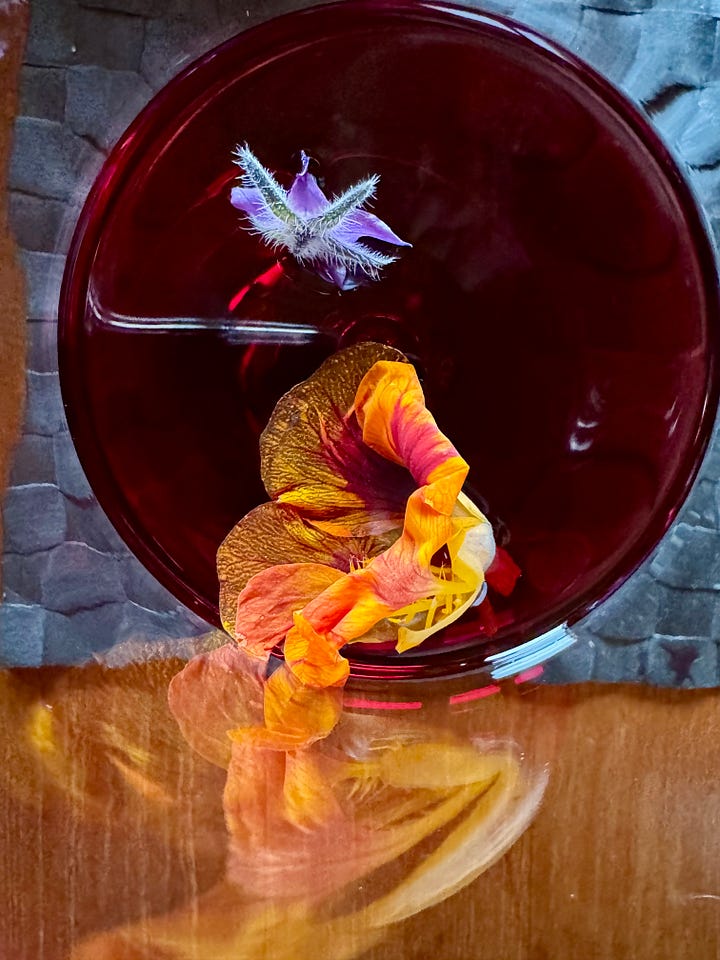 We had fun with this wine over a winter soup (cabbage, tomato, onion, lentils) lunch by serving it with frozen flowers, nasturtium and blue borage (see the Chaos story above). Unlike ice cubes they don’t melt water into your wine. They are edible and didn’t stay in the glasses long enough to have an impact on the wine. They made for some interesting photo effects, with everyone’s cameras out.