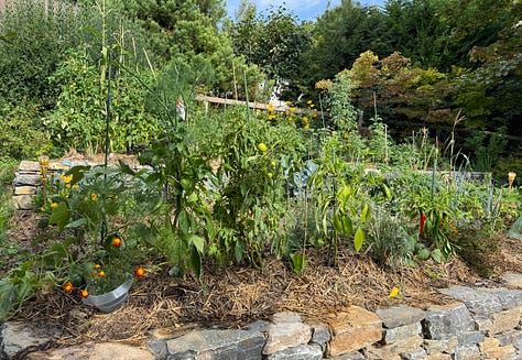 A permaculture garden like mine is chaotic. To the eye of anyone who believes soldiers and plants should march in tidy rows, it looks all wrong, inefficient surely. Peppers weave through tomato vines, vividly orange nasturtium flowers are intertwined with beans and leeks, Chinese mustard spins out yellow flowers but it also has seeds on spindly stalks that spill over straggly potatoes when bumped. More mustard next year, guaranteed.