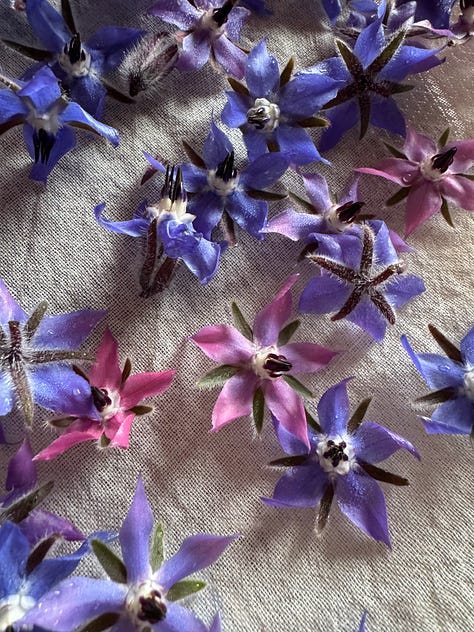 Kitchens are places for joy, no room for kings here, so I brush them aside. Star-shaped small blue flowers, borage, are slowly drying in the oven while tomatoes are lined up like soldiers (the kind that respect and serve the people) next to the cutting board, chicken bones have joined forces with carrots and celery and onions and garlic in a heavy pan of water for a few hours of gentle palaver. Simmering, drying, chopping, baking, sterilizing — more harvesting, of kale and apples before sundown. It’s an October gardener’s day, the kind that offers the comfortable illusion of orderliness, of life under control…