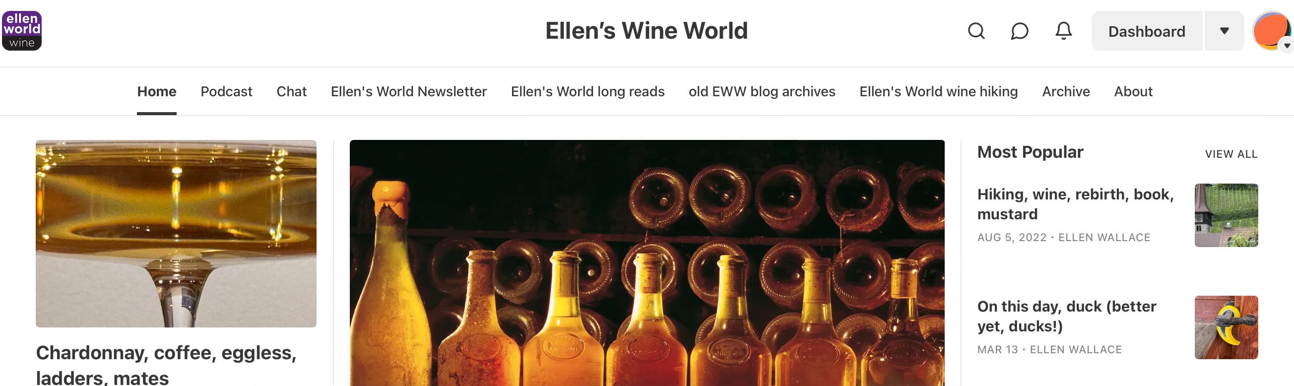To do this, first find your subscriptions. Go to your home page on substack.com by selecting the top left icon, an orange and white bookmark. On the home page, select the orange ball at the bottom left of the screen. This gives you a menu; select “settings”. In settings scroll down to “subscriptions” and this will give you a list of all your subscriptions. For Ellen’s Wine World, you should see the four posts (Ellen’s World newsletter, Ellen’s World long reads, Ellen’s World wine hiking, archives from my old blog) and the Chat thread. Select the ones you want to receive by email/on the app. You can change these at any time. Do the same for all of your subscriptions. For me, if you want to see only photos, select only the Chat threads. Just the newsletter? Select only that one. Here’s my corresponding home page with the top menu showing these.
