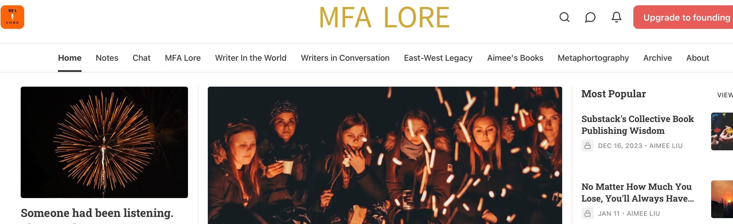 Here’s what my Notifications look like for Aimee Liu, an author and writing teacher I subscribe to—she’s an excellent helper to writers. Note that all are for posts except the last one, which is for her Chat threads. Compare this to the menu on her home page.
