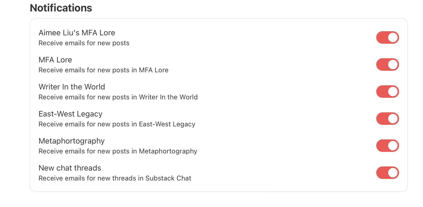 The key here is managing “notifications” for each subscription—if you subscribe to five writers, you need to go to your settings for each one and select only the posts you want to receive.