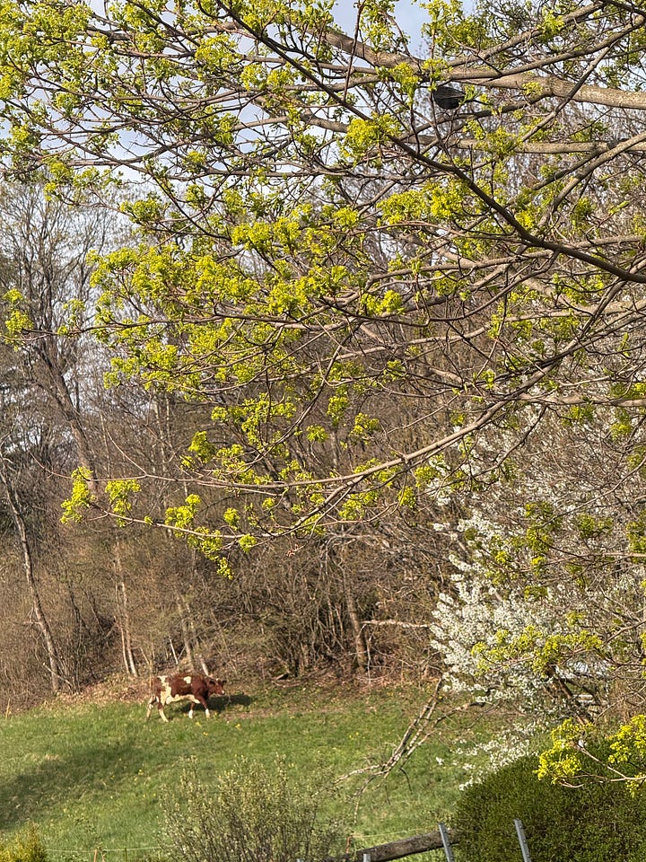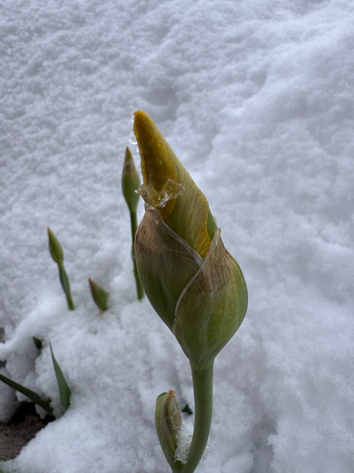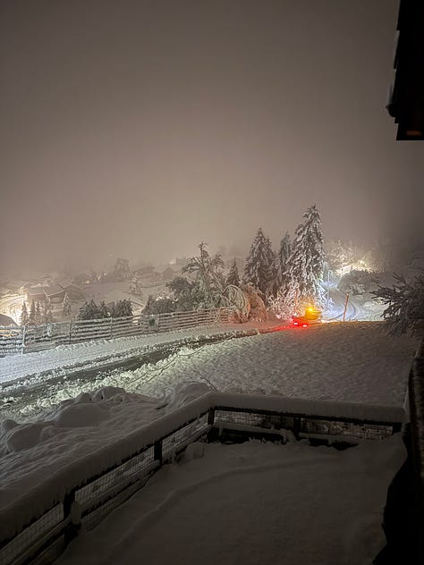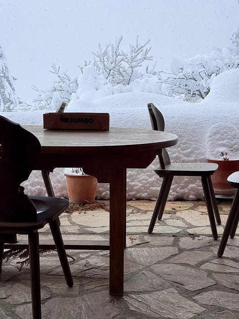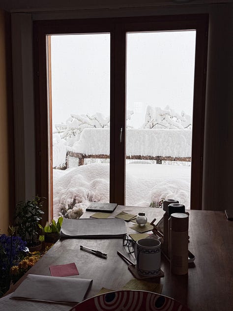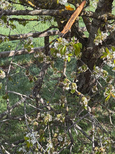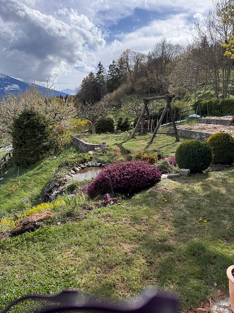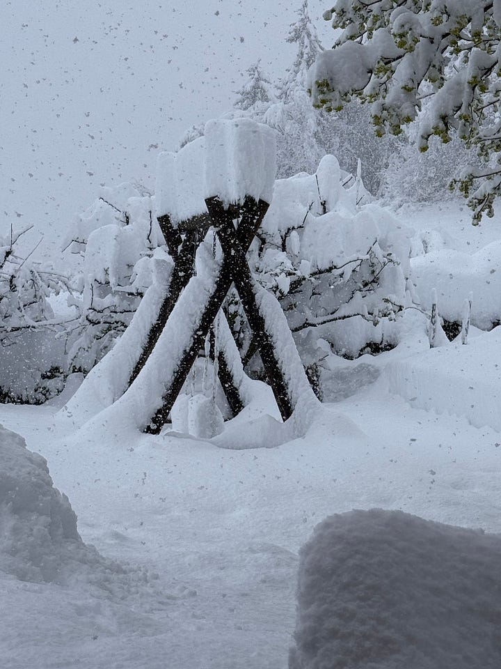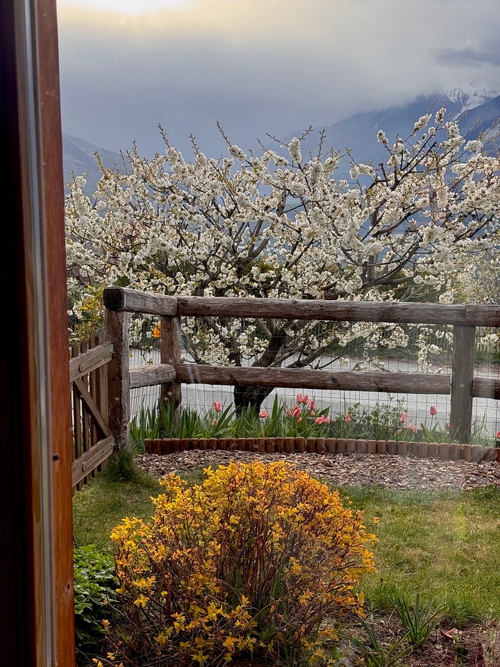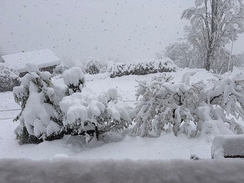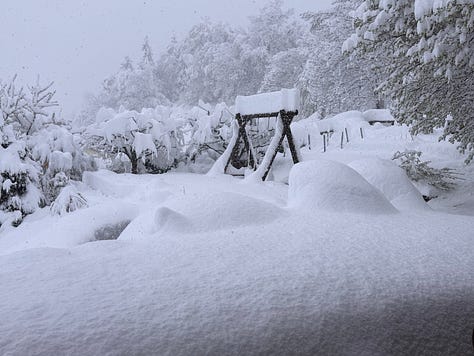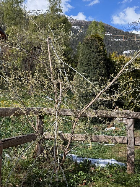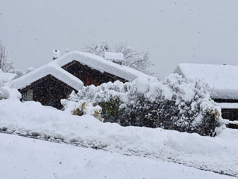 These are photos from my garden before and after our extraordinary April 17 snowstorm in the Alps in Valais, Switzerland. Spring arrived, the cows were out in the pasture next door, flowers were up—and then we had a surprise record 100cm of snow in 24 hours, more than forecast. Power lines and large tree branches went down under the weight of it, bushes were broken in two. This is Switzerland, so people sensibly stayed home and allowed the snowplows to work: they were out in force all night and day. Remarkably, the snow disappeared within 48 hours as temperatures suddenly rose. (Northern Italy suffered more, with heavy rains leading to swollen rivers, flooding and mudslides.)